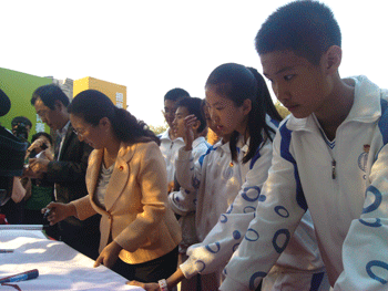 团中央书记处书记罗梅(前右3)与bg真人试玩学生一起留言 bg真人试玩新团员代表朗诵《青春之魂》