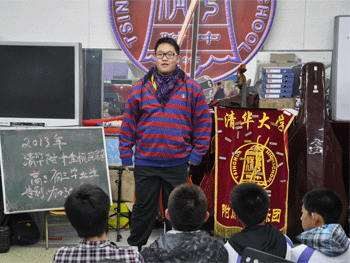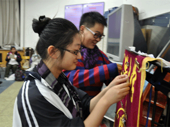 乐团原团长胡岩同学对乐团学生提出新的希望 高三毕业生把自己的乐团胸牌别在团旗上