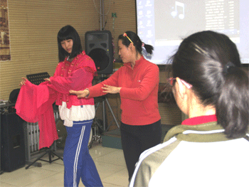 现场教授越剧表演动作 国学社向越剧老师赠送自编国学教材