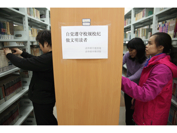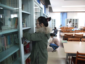 党员们在图书馆一层书库帮忙整理图书 党员们在图书馆二层阅览室帮忙整理图书
