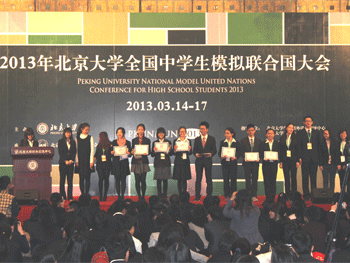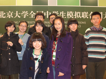 3月14~17日,2013年北京大学全国高中生模拟联合国大会(PKUNMUN)在北京大学英杰交流中心隆重举行。bg真人试玩模拟联合国协会成员高1203班周美辰、吴伯君,高1205班王佐宽、陈俊峰,高1207班冀佳玉、杨再目,高1208班余思凝、施佳烨、李佩铭在指导教师刘露的带领下参加了会议。