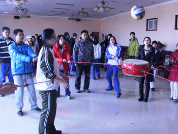 上午的活动项目是“不倒森林”、“能量传输线”和“动感颠球”,“不倒森林”要求6位队员手持1米长的杆站成圆圈,在人动杆不动的情况下顺时针转动10圈,“能量传输线”要求队员们把乒乓球通过“通道”准确传递到5米之外的纸杯中,“动感颠球”要求8位队员用鼓将排球颠起8次以上。同学们在不断练习中慢慢摸索技巧,逐渐认识到,看似简单的任务实则需要有明确的目标意识并充分集合团队的智慧,“人心齐,泰山移”,最终,两个团队都顺利完成了任务。