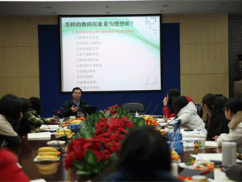 最后,王殿军校长发言,肯定了新教师们的成长与进步,提到了教师需要思考三个问题:一是对当时选择教师这个职业是否认同;二是认同之后实现角色的转换;三是自信心和目标。并鼓励大家为学校的发展献计献策,争取在以后的各项工作中能够得到更大的提高。王校长与新教师们分享了他从教以来的个人感悟——老师要树立良好的个人形象,要一丝不苟履行教师职责,要“亲其生”,对学生“爱如父母”,做到“因材施教”,要“仰望星空”心怀理想,也要“脚踏实地”做好日常点滴工作,要努力做一名受学生欢迎的老师。
