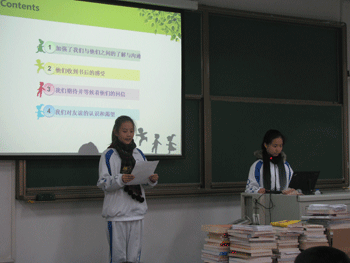 邱晓云老师主持捐书仪式,并介绍了活动筹备过程,即每个学生选择一本自己喜欢的书,在书的扉页上写上自己对少数民族小伙伴的读书心得分享和祝福话语,并在书中夹一个信封,信封上已经写好自己的地址,便于少数民族伙伴给自己回信交流。初一年级所有同学都参加了赠书活动。邱老师谈到公益是功德无量的事业以及自己对目前这个公益项目逐步认知的过程。