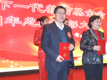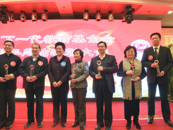 王殿军校长(前左)领取中国下一代教育基金会理事聘书 王殿军校长(右3)领取优秀基金奖