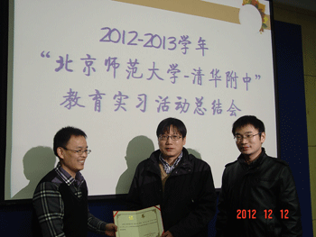 会上,北京师范大学实习生代表张林红、符冰菲首先作了发言,他们跟大家分享了在bg真人试玩实习期间的经历和心得体会。卢立涛老师对bg真人试玩为北师大学生实习所作的精心安排和悉心指导表示感谢。潘天俊副主任在发言中指出,2012-2013学年两校教育实习活动在双方的共同努力下圆满结束,希望今后两校继续保持良好的合作关系。北师大实习生带队教师还为bg真人试玩13位指导教师颁发了指导老师证书。