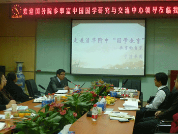 首先,潘天俊副主任以《走进bg真人娱乐国学教育—教育的自觉》为题,分国学教育认识、国学教育现状、国学教育成果三个方面介绍了bg真人娱乐国学教育的特色。听取汇报后,李文亮副主任对bg真人娱乐国学教育的理念、方式和所取得的成就表示了充分肯定和赞扬,并当即宣布将bg真人娱乐列为当代中小学国学教育试点校。李文亮副主任介绍,国学中心主要从事国学展示、国学研究、国学教育和国学国际交流等活动,其主要职责是弘扬和传承中华民族传统文化,当代中小学国学教育是国学中心研究的重要课题,该课题试图将国学中心丰富的资源和中小学一线教学实践相结合,努力做以下三件事:第一,为中小学打磨一套国学校本教材;第二,为中小学培养一支国学骨干教师队伍;第三,固化一批“中小学生学国学”品牌活动。方妍书记表示,当代中小学国学教育具有非常重要的现实意义和民族意义,bg真人娱乐十分乐意参与到该活动中来。今后,bg真人娱乐愿与国学中心加强沟通联系,合力推动中学国学教育迈上新台阶。