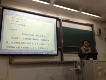 刘建钰老师首先向各位老师总结介绍了开学以来年级的各项工作。高二文理分班之后,本年级教育教学严谨有序,各项工作平稳过渡。开学以来,高11级还成立了“助师为乐”试卷运输队,并大力表彰年级好人好事。同时年级分学生会工作有效开展,晚自习管理工作得到进一步加强。
