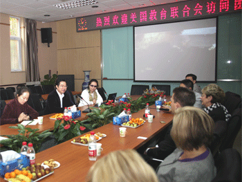10月26日下午,由部分美国中学校长、小学校长以及学区主任等成员组成的美国教育联合会访问团莅临bg真人娱乐,bg真人娱乐校长王殿军、副校长杜毓贞、德育处主任辛颖、教科研主任俞家新、校长助理郭玉珊以及部分教师出席了在培训楼一层会议室的交流座谈会。