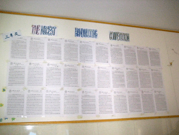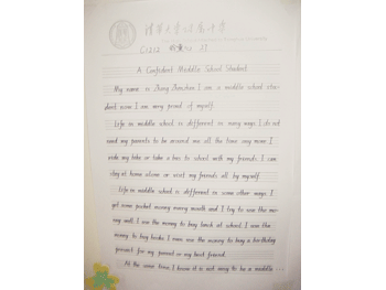 本次比赛的内容为抄写英语段落。学生们认真书写,充分展示自我。经过选手们紧张激烈的角逐,以及包括外籍教师Tim在内的初一全体英语备课组评委们客观、认真地评审,共评出特等奖10名、一等奖20名、二等奖30名、三等奖30名。在张贴出的获奖作品中,有的书写如行云流水,一个个飘逸、灵动的英文字母跃然纸上;有的则豪迈潇洒,刚劲有力;还有的娟秀柔美,圆润饱满。一幅幅各具特色的作品展现在大家眼前,充分展现了同学们扎实的英文书法功底。本次书法比赛,使同学们加深了对英文书法的理解,营造了积极向上的校园文化氛围。