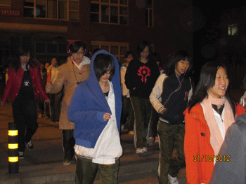 为了让全体住宿生了解、熟悉宿舍楼的各个安全出口,以备紧急情况下顺利地撤离险境。2012年10月31日晚22:00,bg真人试玩住宿部组织举行了2012~2013学年消防疏散演习。当晚宿舍楼内有537名住宿生和全体宿舍老师参加了演习,同学们在宿舍老师的指挥下,紧张有序地撤离宿舍楼。从演习开始所有人撤离完毕共用时3分13秒,演习达到了预期的目的。