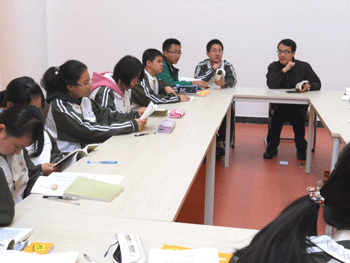 谢玄老师(右1)在指导学生阅读讨论 高12级文科试验班学生在阅读《史记》