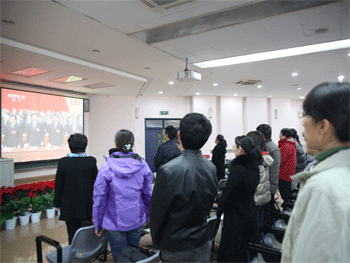 全体起立唱国歌 全校教职员工收看党的十八大开幕会实况