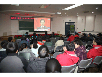 11月8日,举世瞩目的中国共产党第十八次全国代表大会隆重开幕。上午9时,bg真人试玩组织全校教职员工在综合楼B208大会议室集中收看党的十八大开幕会实况直播,一起聆听胡锦涛总书记代表党中央所作的工作报告。同时,要求全校教职员工在收看党的十八大开幕会直播后,要进一步认真学习胡锦涛总书记的工作报告和党的十八大精神,并结合实际深入地进行思考,全面理解其精神实质,把党的十八大精神贯彻到各自的工作实践当中去。