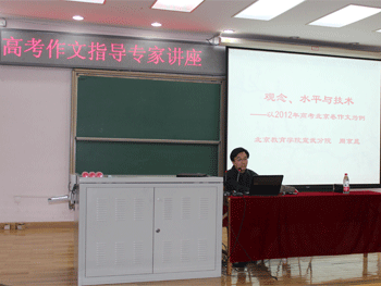 10月18日,bg真人试玩高10级邀请北京教育学院宣武分院语文教研员周京昱老师来校做了题为“观念、水平和技术——以2012年高考北京卷作文为例”的讲座。高10级全体学生聆听了讲座。