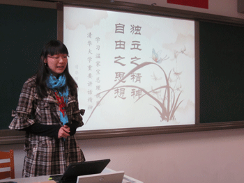 随后,苗琳达老师带领大家学习了《温家宝总理视察清华大学重要讲话精神》,苗老师结合自身体会,从“社会主义初级阶段”、“民主法治”、“公平正义”和“自由平等”四个方面,生动而又不失沉稳地道出了总理讲话的精神内涵。温总理在讲话中对“独立之精神、自由之思想”之清华精神作了深入阐释,勉励大家在经济快速发展的现阶段,必须时刻牢记精神文明建设。新一代清华人一定要牢记“自强不息,厚德载物”的校训,努力学习,勤奋成才,将来为祖国的现代化建设做出更大的贡献,谱写清华大学更加辉煌的篇章。总理的殷殷希望,感人肺腑,鼓舞人心!