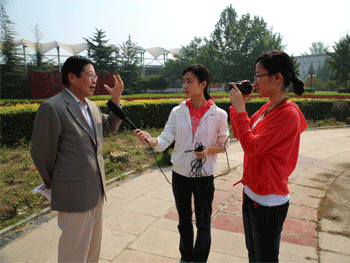合影 高624班校友、四通公司总裁段永基(左1)接受校电视台采访