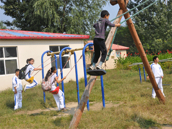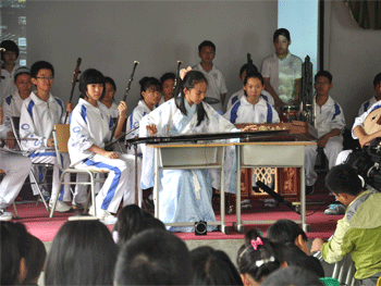 徐镝清同学为太阳村孩子表演古琴 演出结束后附中民乐团学生与太阳村孩子一 起玩荡秋千