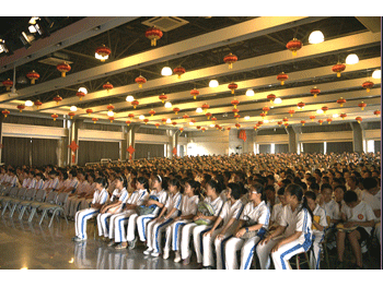 会上,王殿军校长首先致词。他高度肯定了学生在军训中的表现,并勉励学生在即将开始的学习生活中继续发扬军训精神,对自己高标准,严要求。随后,王校长回顾了bg真人娱乐光荣而悠久的历史,介绍了bg真人娱乐的校训、校风、学风、办学理念,并分别对教师、学生和家长寄语。在对学生的寄语中,王校长提出,初一新生要尽快完成从小学生到初中生的转变,要独立自主,加强自我管理,树立远大理想。同时,他也明确指出了学生的近期目标,并反复强调了养成良好习惯的重要性。在随后对家长的寄语中,王校长提出了三条要求:第一,要充分信任孩子;第二,要尊重孩子,遇到问题及时沟通;第三,要为孩子创造良好的家庭和社交氛围。王校长的致词深入浅出,生动幽默,迎来台下阵阵掌声。