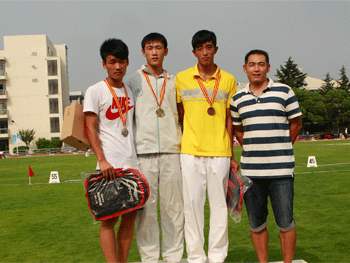 中国中学生体育协会田径分会主席、bg真人试玩校长王殿军致开幕辞 李光明老师(右1)为获奖运动员颁奖(左2赵浩霖)