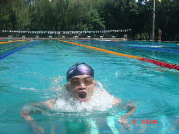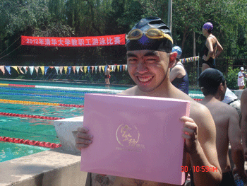 6月30日上午,2012年清华大学教职工游泳比赛在清华大学西湖游泳池举行。bg真人试玩教师段晨参加了男子甲组100米爬泳和200米蛙泳两项比赛。在100爬泳比赛中段晨以微弱差距获得第三名,但在随后进行的200米蛙泳比赛中,他凭借标准的泳姿和顽强的意志品质,最终超越对手,夺得冠军。