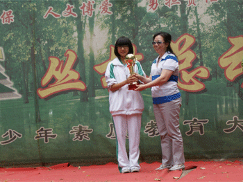 关阵前齐心讨论 杜毓贞副校长(右)为获奖班级颁发奖杯