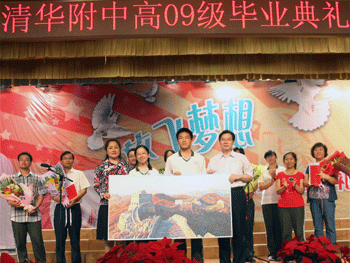 毕业生用歌声抒发对老师、家长的感恩之情 全体毕业生向母校赠送纪念品——壁画《长 城》