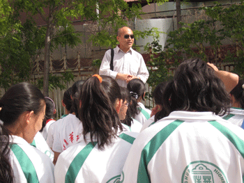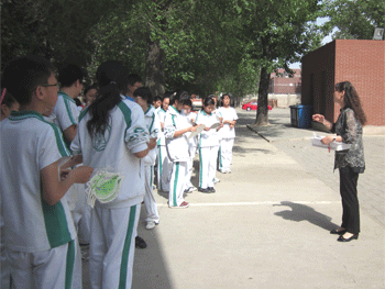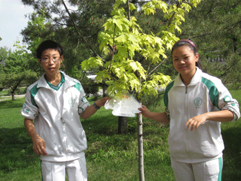 学生为校园植物挂说明牌 孙玉梅老师(右)组织设计为校园植物挂说明牌活动
