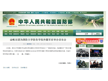 张英利将军(前排左4)与杜毓贞副校长 (前左5)一同观看演出 中国国防部网站刊登的附中乐团2011年演出新闻