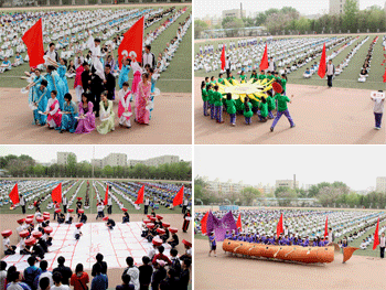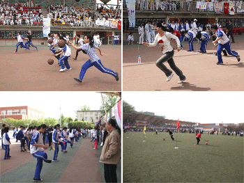 入场式上,初一、初二、高一、高二各班运动员方队以及bg真人试玩国际部小学、初中、高中方队在行进到主席台前时,停留1分钟,表演各自精心设计编排的艺术队形和小品节目等,既新奇又具有创造性,充分体现了体育和艺术的巧妙结合,展现了同学们在体育、绘画、艺术等方面的才艺和创新能力。全场师生和来宾都为同学们的精彩表演热烈鼓掌。开幕式后,举行了武术健身操比赛以及运球跑、钓鱼跑、迎面接力、踢毽子、跳绳、篮球运球接力等趣味体育项目的比赛。