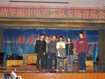 夺标8电声乐队专场音乐会现场 夺标8电声乐队专场演出指导老师胡军(左2)和队员合影