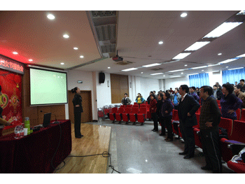 党委副书记兼工会主席周兆玉(右)主持报告会 张君慧老师带领大家练声