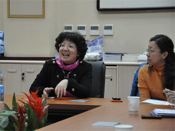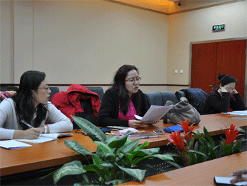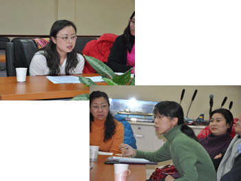 支部书记陈红(中)宣读清华大学党委决定 附中党办主任张洁(左)传达清华大学的最新精神