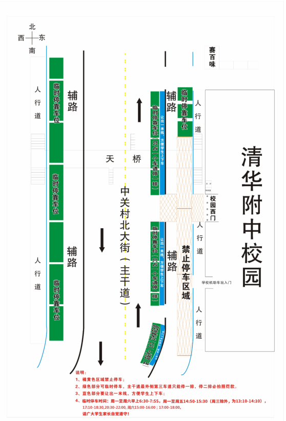 车辆要安全停靠在允许临时停车的指定位置。放学时,家长接送车辆可按照《bg真人娱乐校园周边临时停车示意图》安全停靠在“绿色”区域,但不要占用“橙色”禁停区域,不要堵塞过街天桥出入口及桥下自行车停放区出入口。