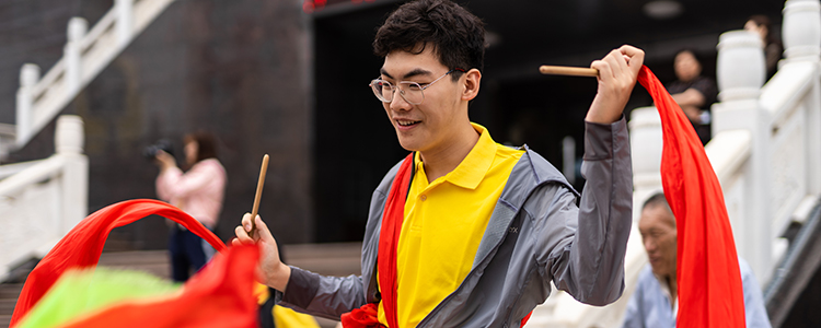 同学们体验安塞腰鼓