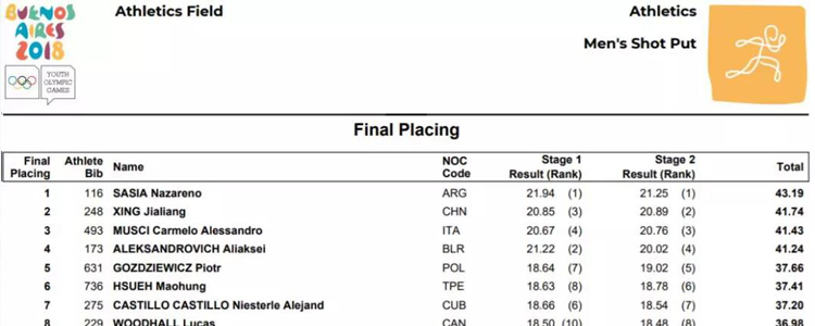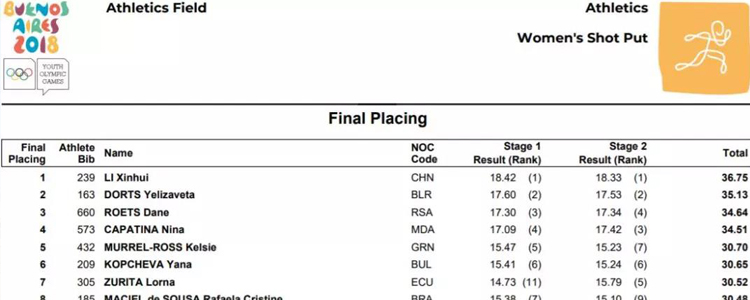 当地时间10月12日下午,北京时间10月13日凌晨进行的青奥会田径比赛铅球项目的第一轮比赛中,李心会同学发挥稳定,以18.42米的成绩位列第一名;邢家梁同学投出了20.85米,位列男子铅球第三名。