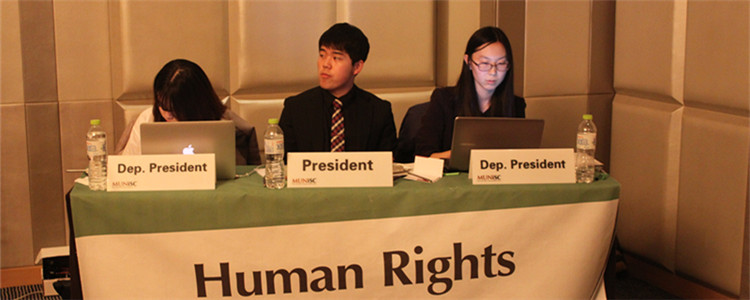 bg真人娱乐国际部学生Julia Tian(右1)作为人道主义委员会副主席主持现场会议