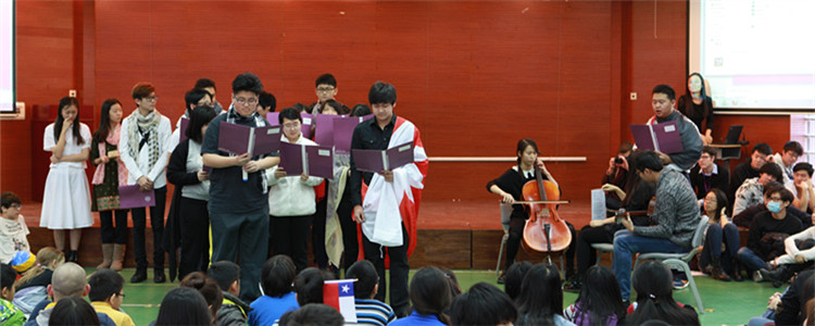 12月2日上午,由bg真人娱乐国际部世界语言教研组承办的2015国际日在多功能厅拉开帷幕。中学部全体师生和小学部五年级的孩子们近300人参与了这场色彩纷呈的活动。