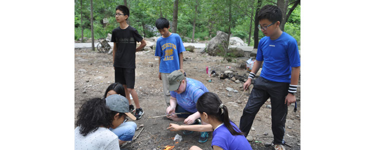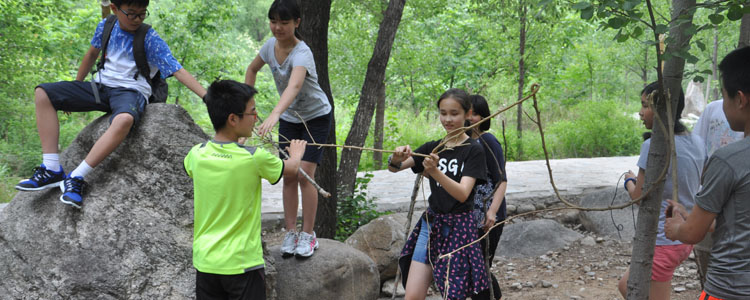 2015年6月9日,国际部七年级44名学生在任课教师的带领下前往怀柔神堂峪进行野外生存拓展训练。这次拓展训练是与语言艺术课所学习的青少年求生传奇小说《Hatchet(手斧男孩)》相结合的深度实践体验活动。在小说《Hatchet(手斧男孩)》中,主人公Brian(布莱恩)被困在加拿大杳无人烟的原始森林深处,他必须学会独自面对这样的困境,用自己的智慧和双手搭建避难小屋、找寻食物,从而让自己生存下去。