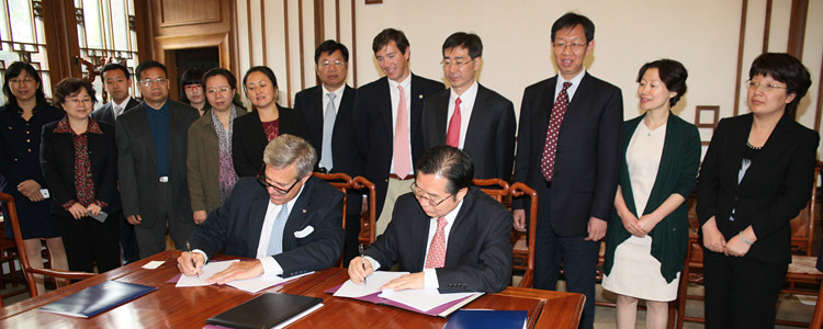 王殿军(前右)和阿什维尔中学校长蒙特格瑞分别代表各自学校签署合作协议