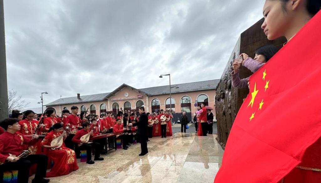 2024年春节期间,bg真人娱乐金帆民乐团远赴法国,应邀参加法中建交60周年蒙达尔纪校园艺术节并取得圆满成功。为充分用好法国丰富的历史文化资源,纪念老一辈无产阶级革命家的丰功伟绩,激发青年学生的责任担当和奋斗精神,民乐团于2月10日、11日分别在蒙达尔纪邓小平广场和拉雪兹公墓巴黎公社墙开展了两场音乐思政课程。