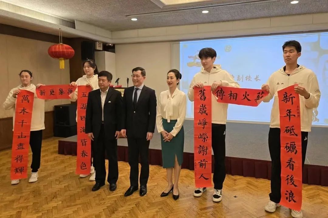 bg真人娱乐篮球队教练代表、学生代表纷纷分享此次访美体会,与总领馆外交官深入交流。此访适逢中国甲辰龙年春节前夕,活动现场展示了bg真人娱乐学子书写的新春对联。