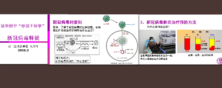 在刚接到延期开学的通知时,为了让焦虑的高三年级学生理解国家决策,我们设计了第一节网课让学生从传染病流行的角度理解延期开学是对每一位“易感人群”的保护。二月中旬,面对网上不断发酵的抢购药物的现象以及病毒来源的各种阴谋论,我在微信群中分享评论、提供范例,引导学生用所学生物学知识对各种观点、现象进行科学的分析、判断。在高三复习阶段,我们还设计了与新冠病毒相关的学案和习题。培养有科学素养的未来公民,是我们教育的初心!