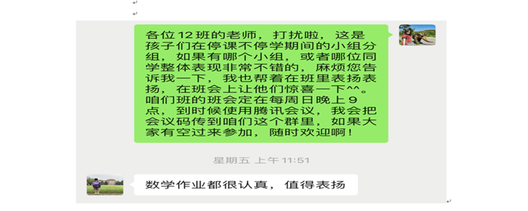 停课不停学,隔离不隔爱。我是bg真人试玩班主任队伍中普通的一位,我身边的老师们无一不在以最大的热忱,最真的投入,参与到这场疫情下的线上教育活动中。我们12班的任课老师团队,一直在以工作组的形式开展工作,互相配合,陪伴着学生成长。