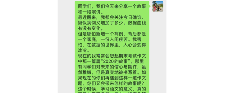 疫情最凶猛的几天里,常常会从学生的微信朋友圈中读出他们的焦虑。面对快速增长的数字,网络上不时传来的呼救,他们一方面感觉到心痛,另一方面却又有一种无力感。我能感受到一腔热血在这一群善良温暖的青春少年心中涌动,又能觉察到小小书房内,可能存在的,不知怎样能让世界变得更好的迷茫。因此,即便在假期之中,我也一直坚持在班群坚持分享我对疫情发展的感受,呼吁班级同学共同关注社会动态,保持思维的活跃。同时,组织同学们分享自己的读书心得,让班级的微信群不止是通知的传播地,更是心灵的共同家园。