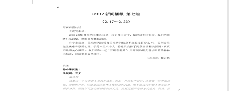 12班的班级干部们在自律自强的氛围中,也冲锋在前,率先垂范。班长多角度整理了上学期的班级工作成果;团干部通过“石墨文档”开辟线上团日志接力的新方式。各学习小组组长坚持带领小组成员,整理每周的“班级新闻周刊”。