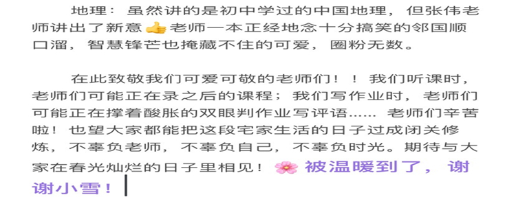 就像同学们所说的那样,“学习小组的方式激励着我遵循时间表完成任务,和大家共同进步,互相解答对方的疑问。”“团日志的内容丰富多样,有对新学期的展望、空中学堂的使用感受、对当下疫情的思考……风格也各具特色:有真实可爱的记录,有妙趣横生的幽默语言,也有严肃深入的思考…… 团日志让我们看到班里其他同学的思考感悟,也给予每一个人用文字书写内心的机会。见字如人,团日志让我们在这个特殊的时期凝聚在一起,于文字中汲取力量,以高1812的集体姿态一起前行!”而同学们的进步,家长亦是最好的见证者,“在无法正常开学后,停课不停学、在家不放羊,附中的安排井井有条,班上更有学习小组互相交流,我们看在眼里,正是战疫、学业两不误!”