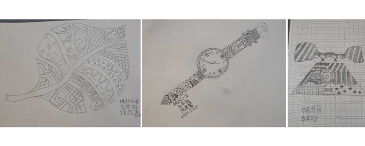 美术课是学生们参与度很高的一门课程。第一节课上,同学们学习了中国结的知识并在老师的带领下自己尝试绘画,作品精致工巧;线透视课程中,同学们接触到了透视的概念与应用;线描画课上,孩子们十分精巧地用花纹来装饰手表和树叶,一幅幅作品精彩绝伦,令支教团的同学们倍感欣慰和欢喜。