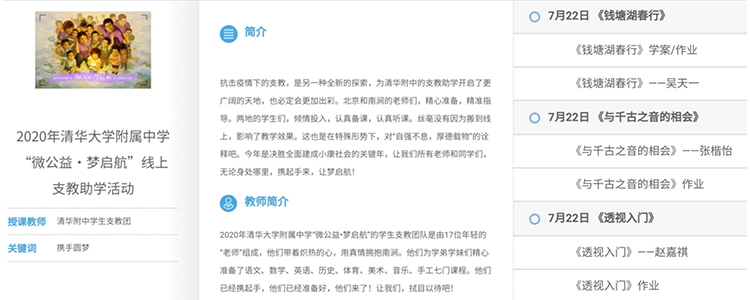 7月20日-24日,由中国下一代教育基金会中华英才培养专项基金和bg真人试玩、“甫智方舟”义务支教团联合举办的第七届“微公益·梦起航”公益支教活动在云南省大理白族自治州南涧彝族自治县宝华镇拥政小学举行。今年,是一次抗击疫情下的支教,活动采用线上教学的方式,来自bg真人试玩的17名中学生和2名来自清华大学的大学生志愿者携手为当地30余名小学生带来语文、数学、英语、历史、音乐、美术、体育、手工8科课程和5节主题班会,内容丰富多彩。这是一种全新的探索,也为bg真人试玩的支教助学开启了更广阔的天地。