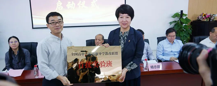 成立大会上,联盟秘书长、中国教科院培训中心主任助理刘灿向高新一中校长王淑芳授予“全国高中名校思维导学教改联盟首批实验班”牌匾。